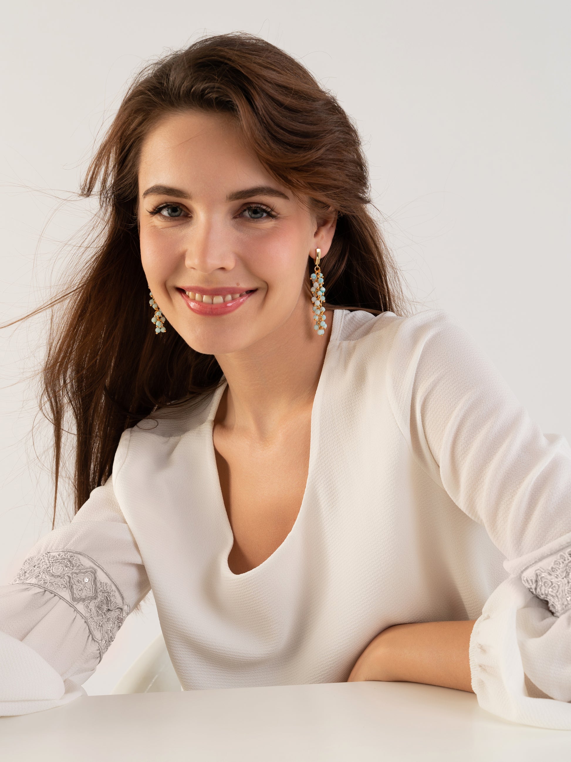 Lunghezza degli orecchini: 75 mm, diametro della pietra: 4 mm, peso: 5 g. La ferramenta in lega per gioielleria è rivestita con una finitura di alta qualità, che non perderà il suo splendore nel tempo.